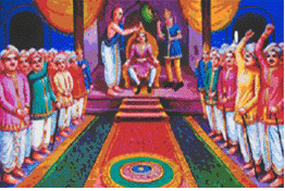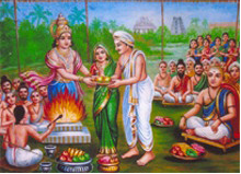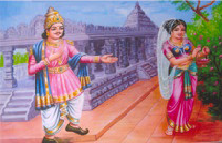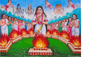 She exhibited her original form of Adiparashakti and vowed that she would remain a virgin. On hearing that Vasavi had declined to marry him, Vishnuvardhana deiced to marry her even by waging a war on Penugonda. In order to prevent bloodshed and to uphold the dignity and honour of womanhood, Vasavi decided to end her AVATAR by offering herself to the God of fire – AGNI.